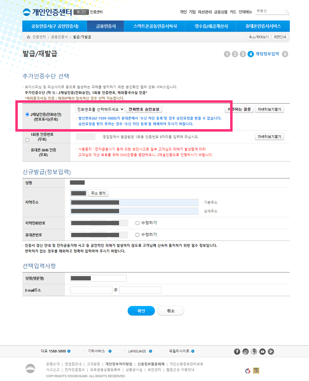 우리은행에서 금융인증서 신규 발급 순서는 1. 홈페이지 인증센터 접속 → 2. 약관 동의 → 3. 본인 확인 3단계 → 4. 금융인증서 발급입니다.