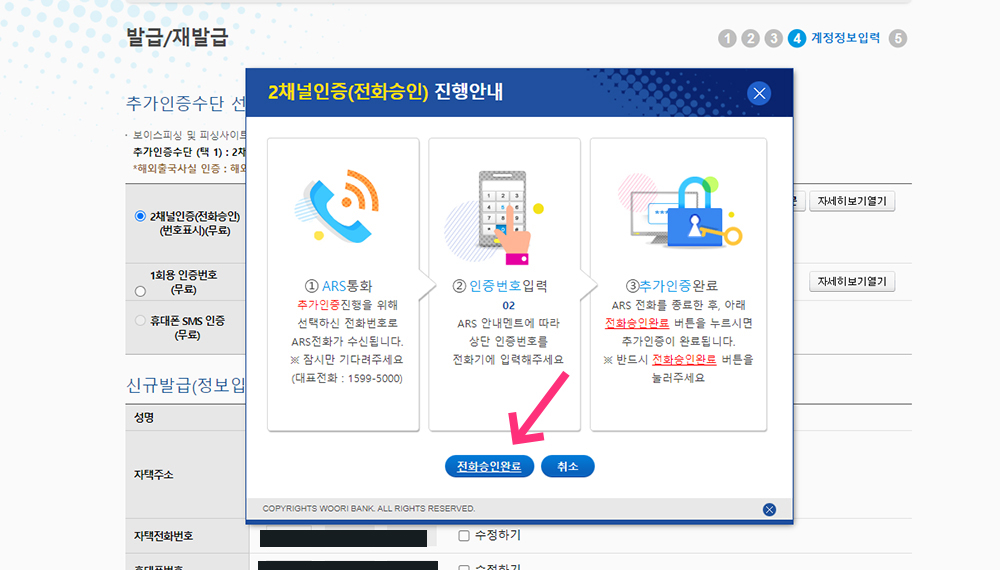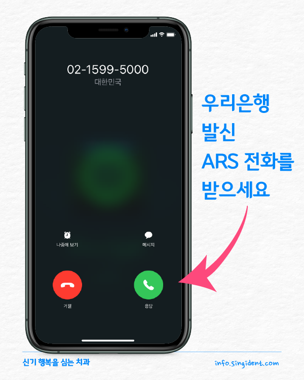 그리고 곧바로 위에서 선택한 본인 연락처로 발신번호 02-1599-5000 우리은행 ARS 전화가 걸려옵니다. 전화를 받으시고 ARS 안내 멘트가 알려주는 인증번호를 본인 전화기에 입력해주세요.