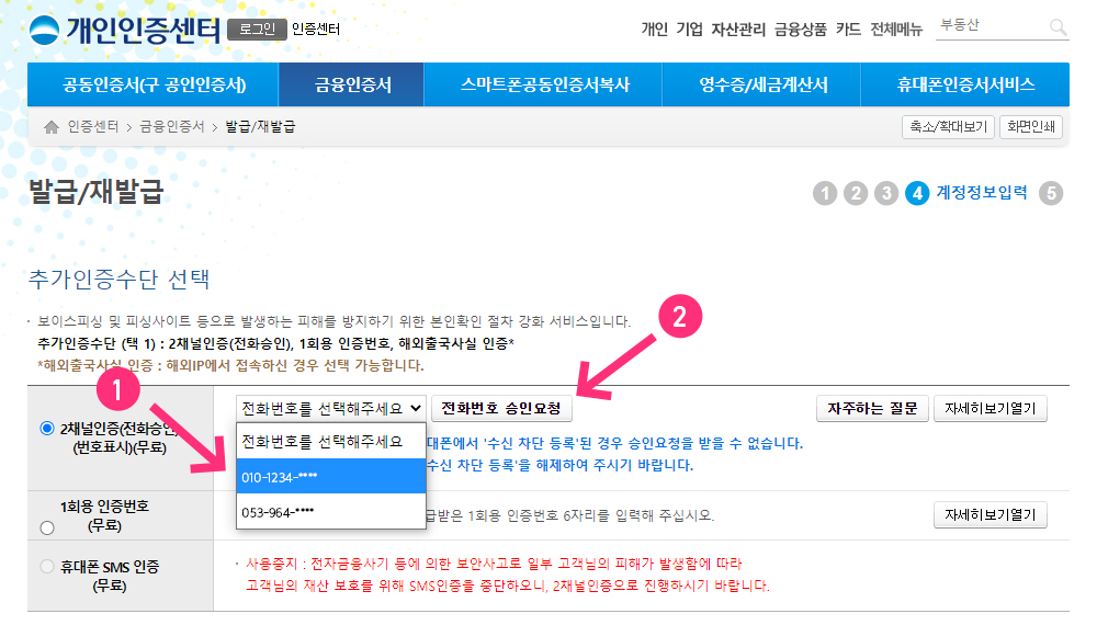 다음으로 추가 인증 수단 선택 페이지가 나타납니다. 추가 인증수단은 '전화승인', '1회용 인증번호', '해외 출국 사실 인증' 이렇게 세 가지 방법이 있습니다. 이 중 원하시는 인증 방법을 선택하세요. 참고로, 보시는 것처럼 문자 인증은 보안 사고로 인해 사용이 중지되었습니다.