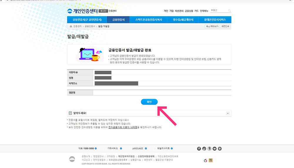 마지막으로 발급 완료 화면이 나타납니다. '확인'을 클릭하세요. 이제 우리은행에서의 금융인증서 신규 발급 과정이 모두 완료되었습니다.