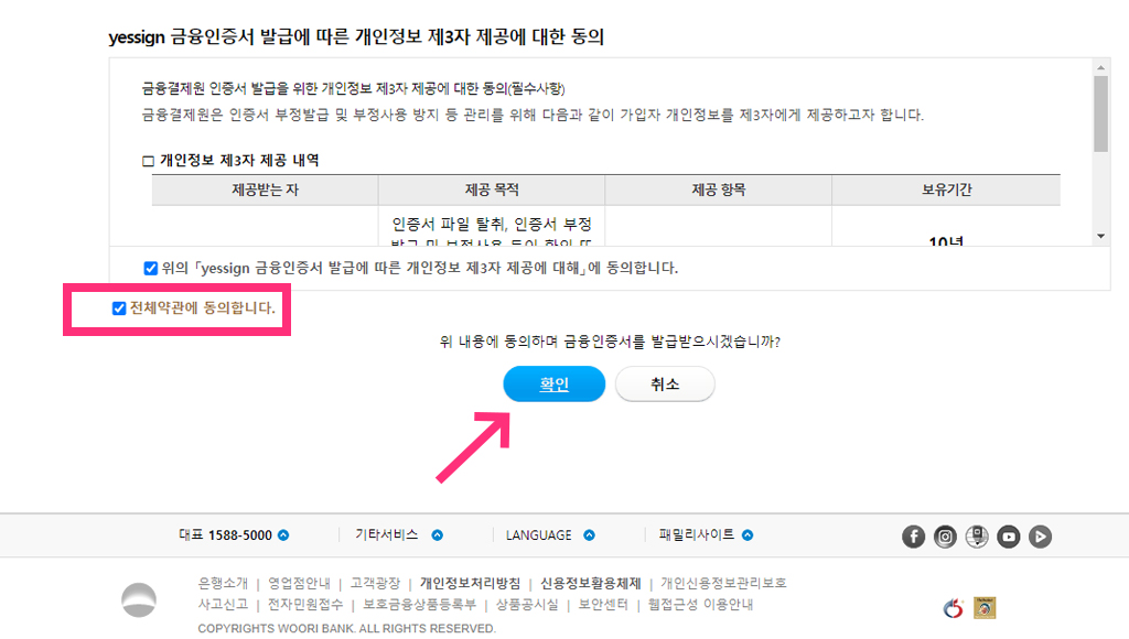 화면 제일 하단에 '전체 약관에 동의합니다'를 선택 후 '확인' 버튼을 누르세요.