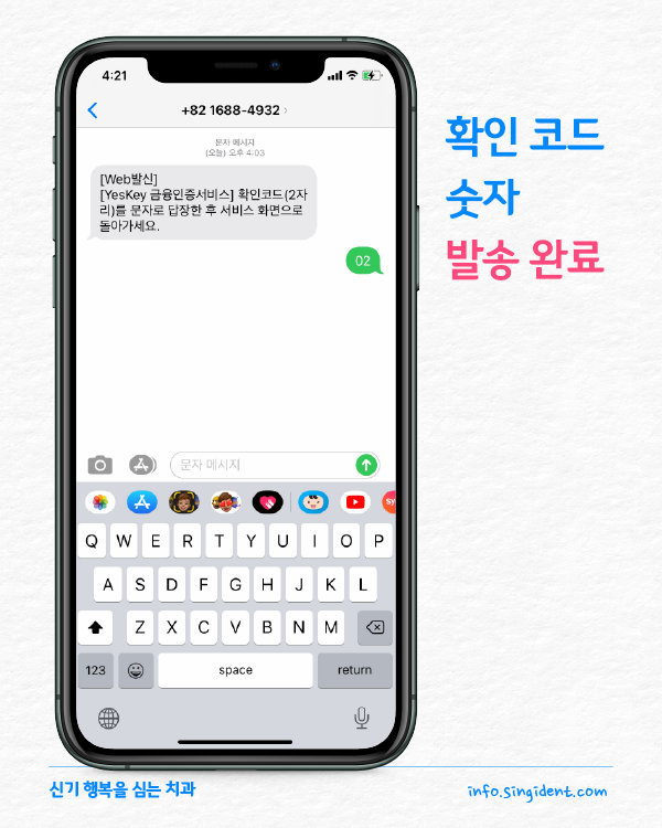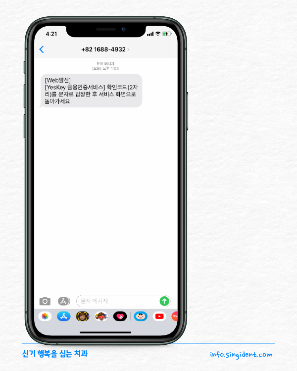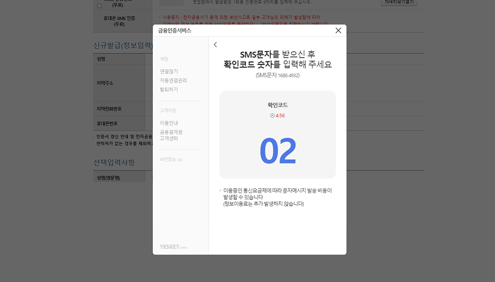 그리고 거의 동시에 앞서 입력한 본인 핸드폰으로 1688-4932번의 YEsKey 금융 인증서비스에서 발송한 문자메시지가 도착합니다.