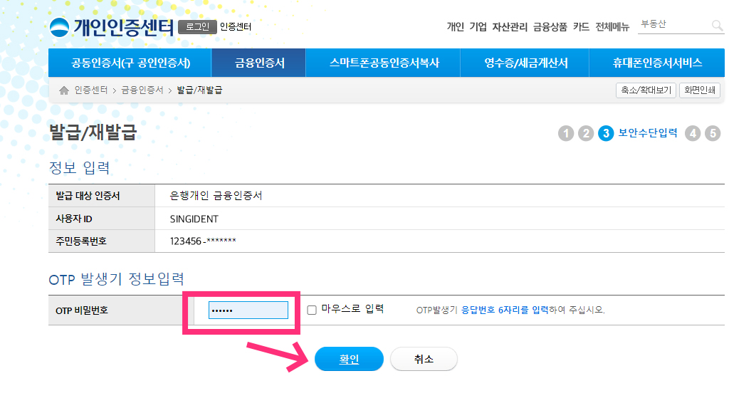 다음으로 OTP 번호 입력화면이 나타납니다. 빈칸에 OTP 발생기에 나오는 번호 6자리를 입력하세요.