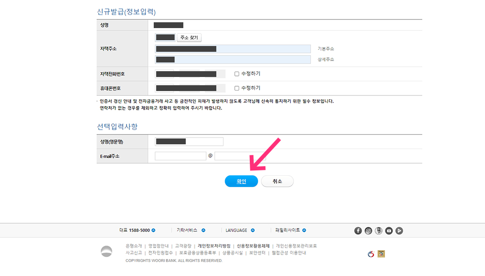 이제 컴퓨터 화면 제일 하단으로 내려와 '확인' 버튼을 눌러주세요.