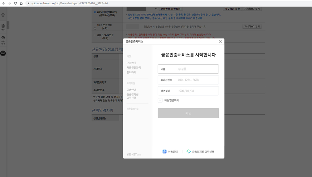 아래와 같이 금융인증서비스 시작 창이 나타납니다. 이름, 휴대폰 번호, 생년월일을 입력한 다음 확인 버튼을 눌러주세요.