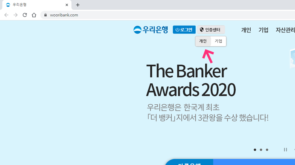 '인증센터' 버튼 위로 마우스를 가져가면 다음과 같이 '개인'과 '기업' 버튼이 나타납니다. '개인'을 클릭하세요.