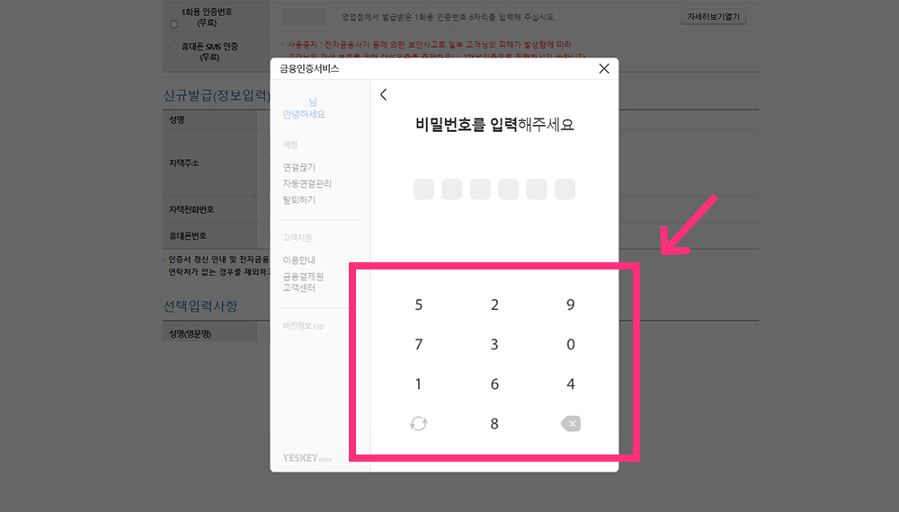 이제 비밀번호 설정 화면이 나타납니다. 금융인증서 비밀번호로 사용할 숫자 6자리를 입력하세요.