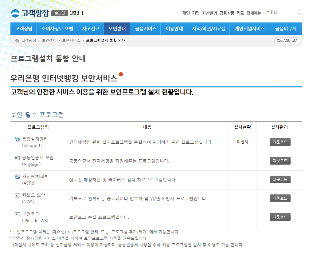 이렇게 보안보안프로그램 설치페이지 이동 후 아래의 보안 필수 프로그램을 전부 설치하여야 합니다. 설치 방법은 생략합니다.