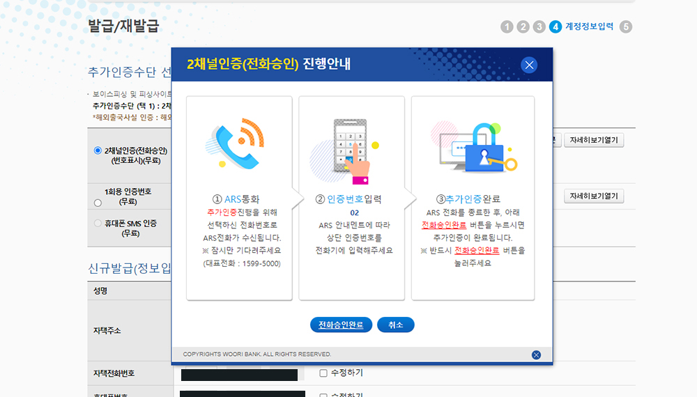 다음과 같이 화면에 2 채널 인증 전화승인 진행 안내 팝업창이 나타납니다.