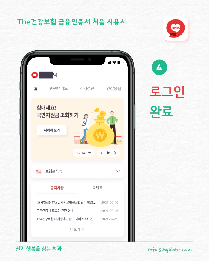 첫방문시 4. 더건강보험 금융인증서 로그인 완료