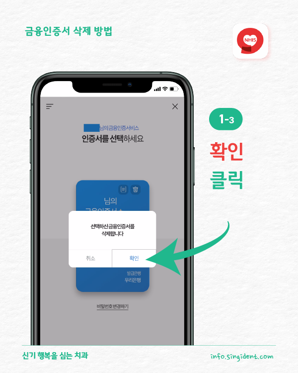금융인증서를 삭제하였습니다. '확인'을 누르세요.