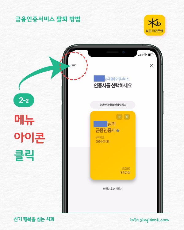 금융인증서 선택 화면이 나타나면 좌측 상단 메뉴 아이콘을 클릭합니다.