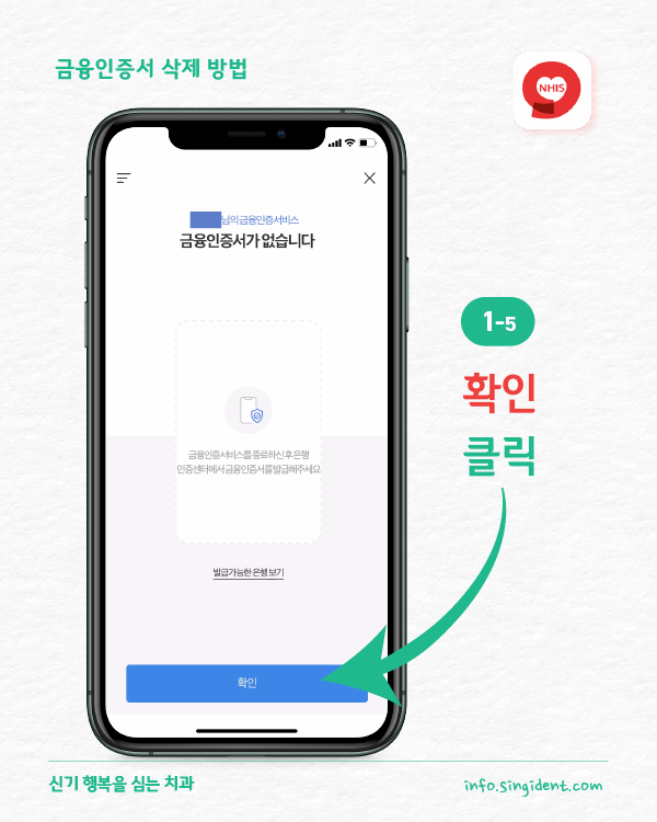 금융인증서를 삭제하였습니다. '확인'을 누르세요.