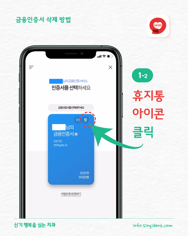 금융인증서 선택 화면에서 다음과 같이 휴지통 아이콘을 클릭합니다.