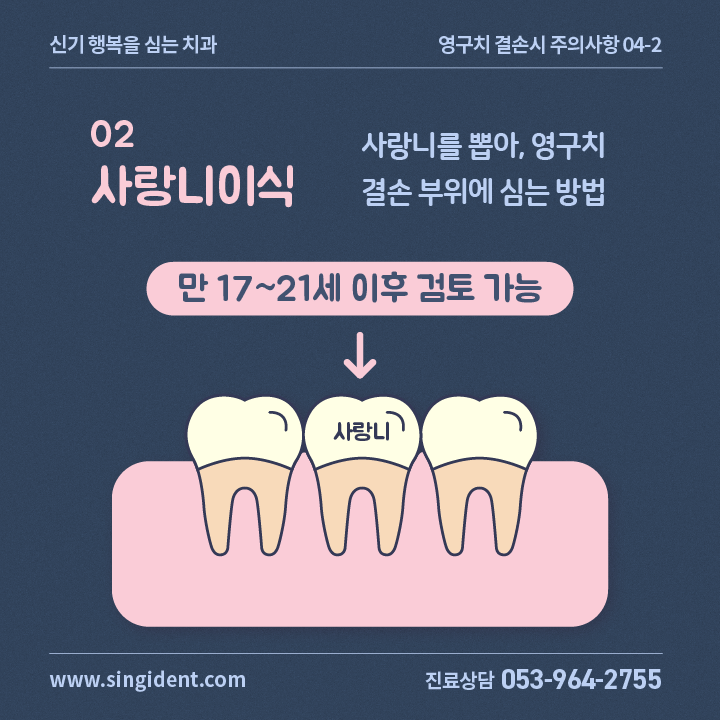 사랑니를 이식하려면, 사랑니가 이식 가능한 상태여야 하는데, 예를 들어 충치나 염증이 없어야 하고, 사랑니가 반듯하게 나야 되는데, 그렇지 않고 누워 있거나 매복되어 있는 경우 등은 이식이 어렵습니다.