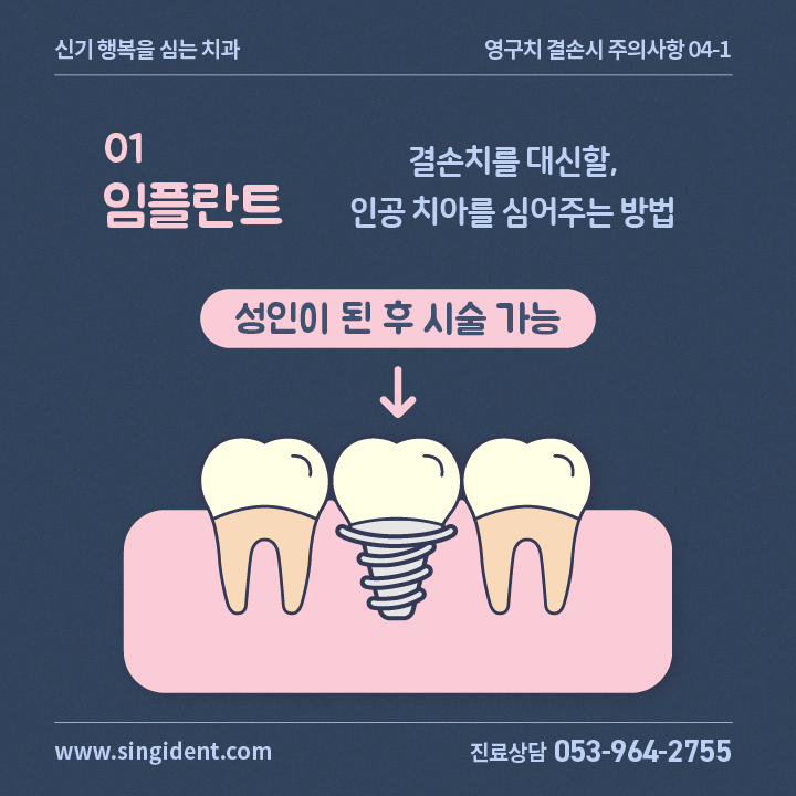 안녕하세요. 대구 동구 임플란트치과, 신기 행복을 심는 치과에서 전해드리는 어린이 치아 상식입니다. 오늘은 선천적 영구치 결손 시 알아야 할 주의사항과 치과적 치료 방법, 그리고 각 방법의 장단점에 대해 알려드립니다.