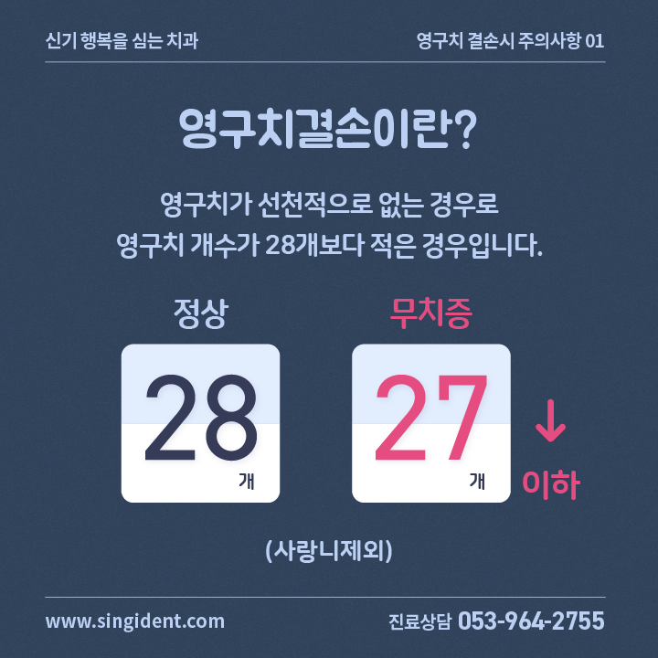 이와 반대로 일반적인 치아 개수보다 이빨이 더 많이 나는 경우도 있습니다. 이를 과잉치라고 부릅니다. 영구치 개수와 유치 개수, 그리고 영구치 나는 시기와 순서가 궁금하신 분들은 다음 글을 참고해주세요. info.singident.com/1