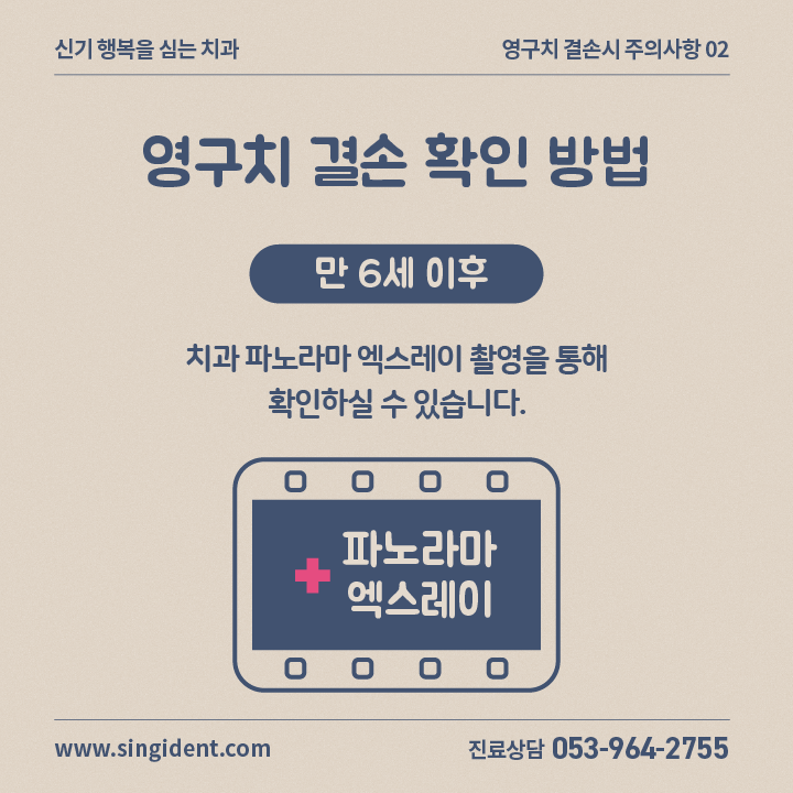 영구치 결손 여부는 만 6세 이후 치과 파노라마 엑스레이 촬영을 통해 확인하실 수 있습니다. 육안으로는 확인이 어렵습니다.