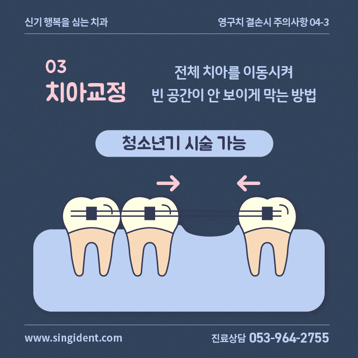 - 치아가 없는 빈 공간으로 주변 치아들이 쏠려 부정교합이나 치열이 흐트러지는 등의 문제를 일으킬 수 있습니다.